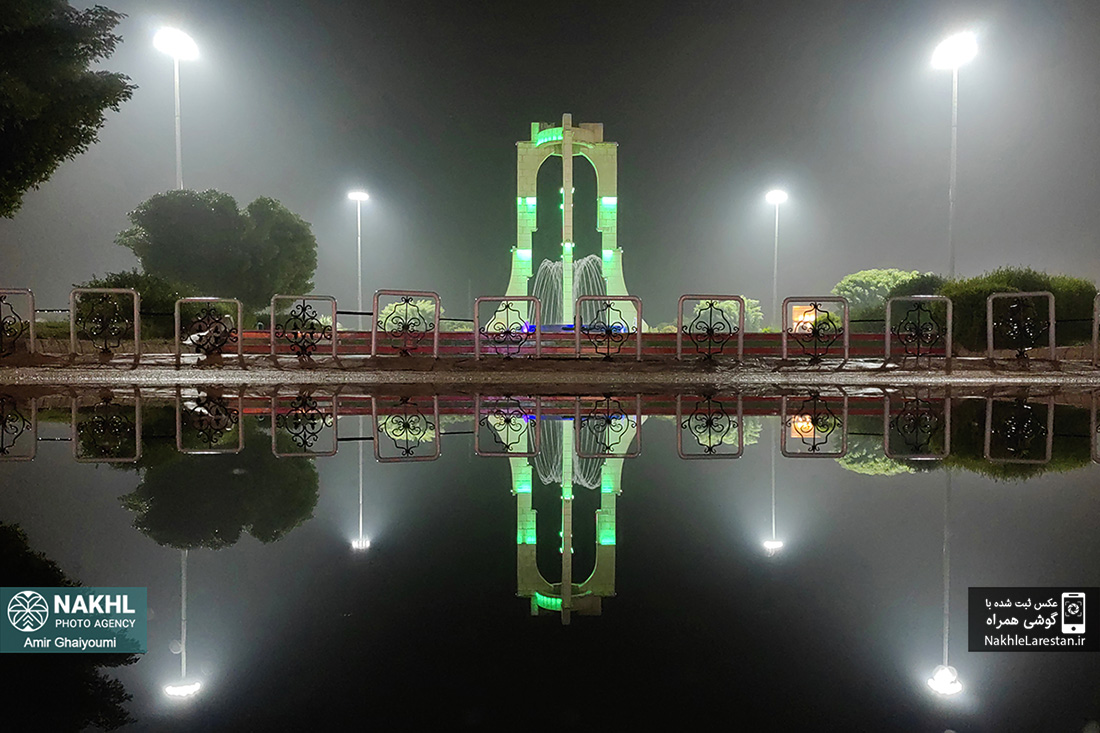 فلکه امام خمینی ره در شب مه آلود شهر لار